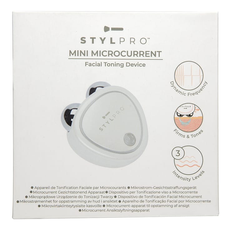 STYLPRO Mini Microcurrent-apparatet anvender mikrostrømme til blidt at stimulere ansigtsmusklerne, hvilket resulterer i et bemærkelsesværdigt løft og en tone, der forbedrer ansigtets generelle konturer.