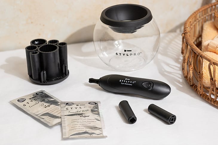 Dette smarte apparat er velegnet til alle typer og størrelser af makeupbørster. Pakken indeholder to poser vegansk certificeret rensevæske, otte børstekraver, selve STYLPRO-apparatet og en ridse- og pletafvisende skål af genanvendelig plast. STYLPRO Makeup Brush Cleanser er specielt formuleret til at fjerne selv den mest genstridige oliebaserede makeup, samtidig med at den plejer dine børster med vindruekerne- og arganolie, der efterlader dem bløde og lækre.