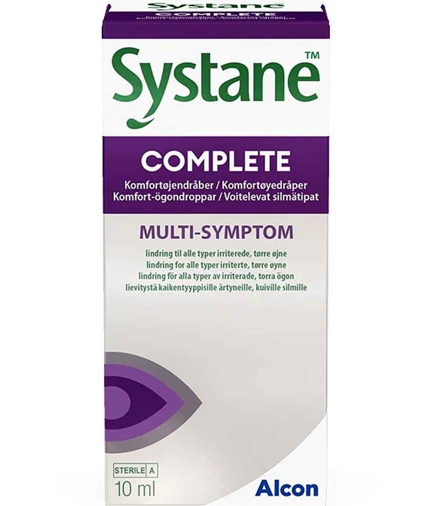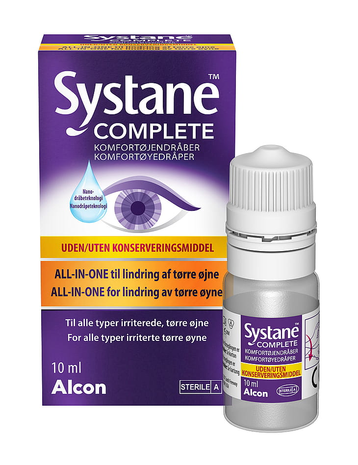 SYSTANE™ COMPLETE komfortøjendråber uden konserveringsmiddel er en alt-i-en formel til alle typer af tørre øjne. SYSTANE™ COMPLETE komfortøjendråber er beregnet til at smøre øjets overflade og giver midlertidig lindring af svie og irritation hos personer, der har symptomer på tørre øjne.