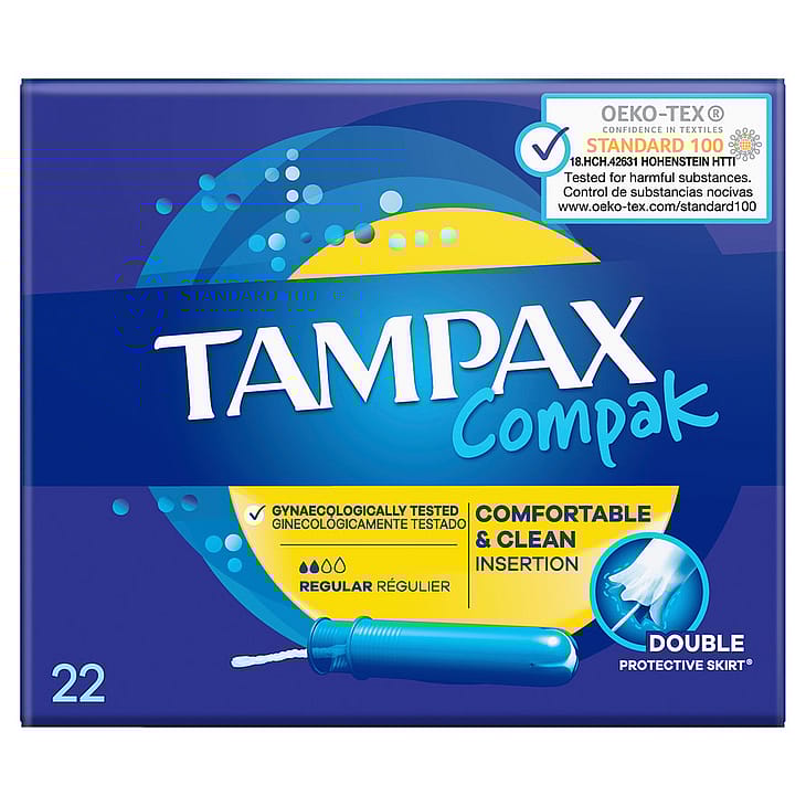 Tampax Compak Regular tamponer giver beskyttelse og diskretion til de dage under menstruationen, hvor blødningen er let til medium. Tamponerne indeholder ingen parfume eller farvestoffer, og leveres med et kompakt indføringshylster af plastik og en afrundet ende, som gør den behagelig at indføre. Med sugende kanaler, der fører væske direkte ind i kernen og en beskyttende kant, der hjælper med at forhindre lækage og giver en ubekymret menstruation. Tampax Compak tamponer er gynækologisk testet. De er også uafhængigt testet for skadelige stoffer og er certificeret af Oeko-Tex Standard 100. Sikker, lækagefri beskyttelse, som lader dig gøre, lige hvad du har lyst til. Tampax Compaks bedste tampon til let til medium blødning.