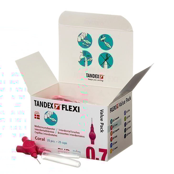 TANDEX FLEXI mellemrumsbørste giver effektiv og skånsom rensning af tandmellemrum. Det bøjelige, skridsikre håndtag gør det let at komme til bagerst i munden og giver samtidig et fast greb. Vælg de størrelser, der passer dine behov bedst. Håndtagsfarve Coral = PHD 0.7/ISO 1 - Cylindrisk børsteform* *Bemærk - NY betegnelse på størrelse, der følger den nye ISO-standard for mellemrumsbørster - produkter og farven er som før. TANDEX FLEXI: Markedets bredeste produktserie indenfor mellemrumsbørster med ialt 15 varianter - 11 størrelser og 2 blødheder. TANDEX FLEXI mellemrumsbørster kan med fordel suppleres med TANDEX PICKI tandstikkere og TANDEX FLOSI tandtråd og flossere.