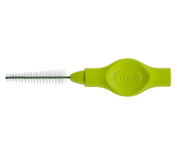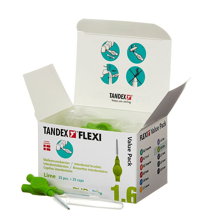 TANDEX FLEXI mellemrumsbørste giver effektiv og skånsom rensning af tandmellemrum. Det bøjelige, skridsikre håndtag gør det let at komme til bagerst i munden og giver samtidig et fast greb. Vælg de størrelser, der passer dine behov bedst. Håndtagsfarve Lime = PHD 1.6/ISO 5 - Konisk børsteform* *Bemærk - NY betegnelse på størrelse, der følger den nye ISO-standard for mellemrumsbørster - produkter og farven er som før. TANDEX FLEXI: Markedets bredeste produktserie indenfor mellemrumsbørster med ialt 15 varianter - 11 størrelser og 2 blødheder. TANDEX FLEXI mellemrumsbørster kan med fordel suppleres med TANDEX PICKI tandstikkere og TANDEX FLOSI tandtråd og flossere.