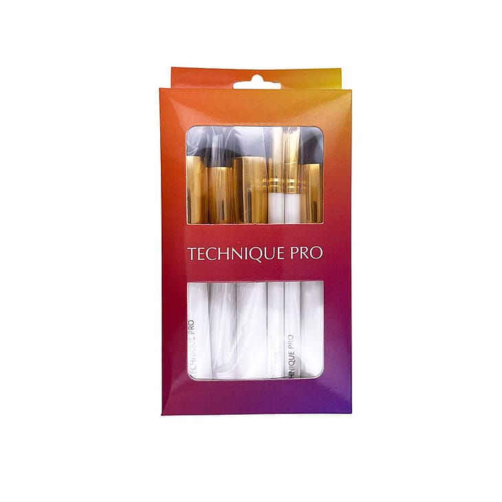Technique Pro Makeup Børste Sæt i GuldTechnique Pro makeup børste sæt i guld indeholder 10 børster i alt - 5 præcisionsbørster og 5 kabuki børster. Børsterne består af tætpakket syntetisk hår i høj kvalitet. Akslen har et greb i mat hvid med guld finish.