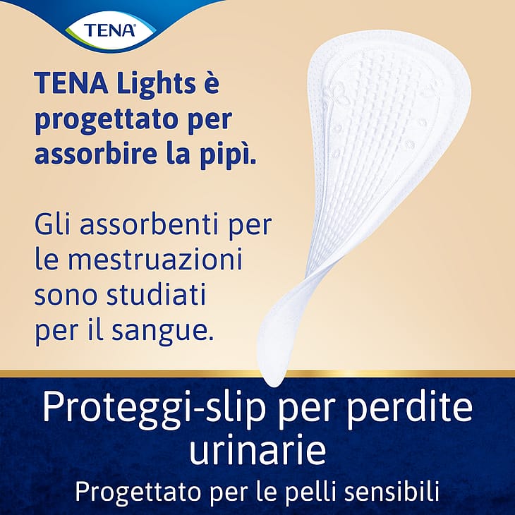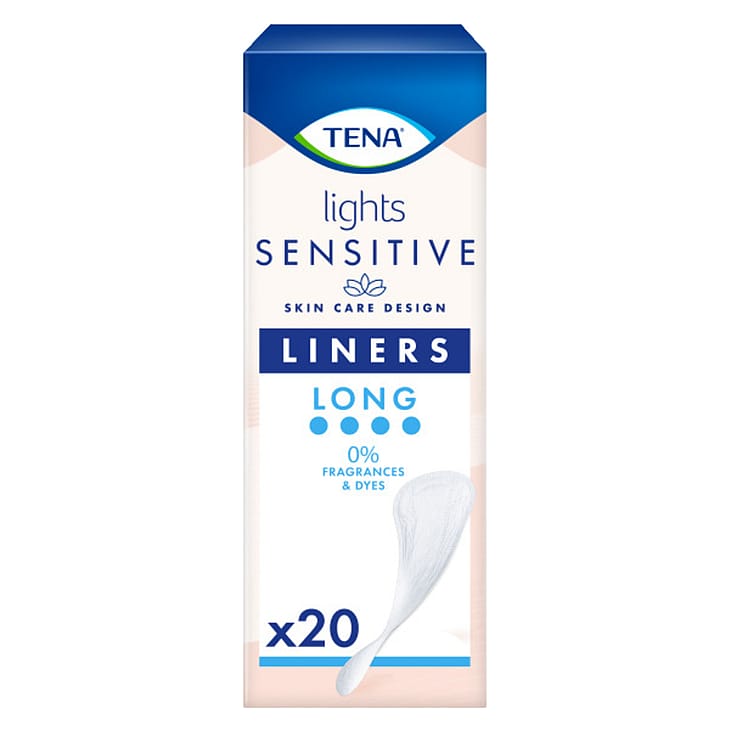 Tena Lights Sensitive Long inkontinenstrusseindlæg til sensitiv hud. Tyndt og diskret inkontinenstrusseindlæg til små urinlækager. Hurtigt absorberende beskyttelse til sensitiv hud. Triple Protection mod lækage, lugt og fugt. Åndbare materialer, fri for parfume og farvestoffer.
