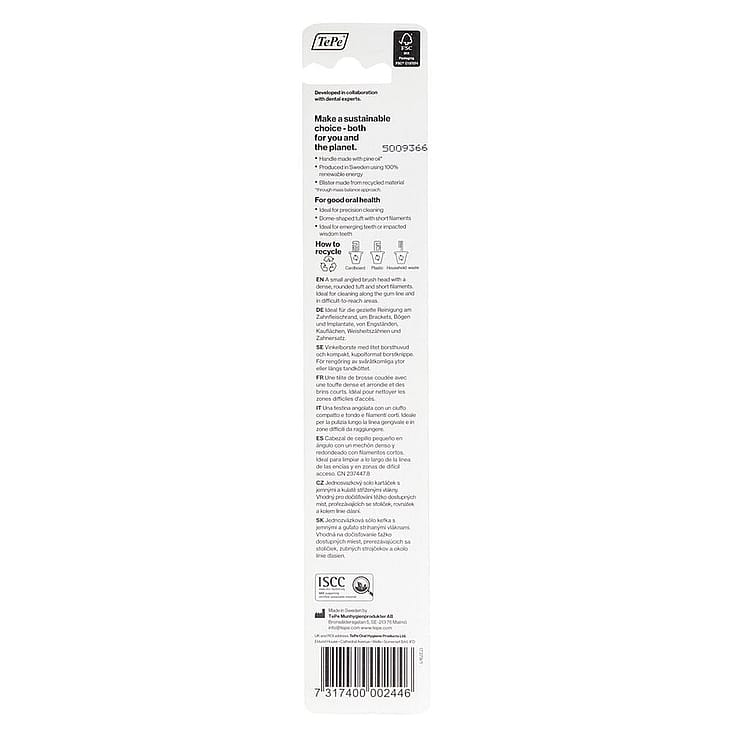Compact Tuft børsten er en kantet børste som kan vinkles til at komme ind i hver en afkrog af din mund. Børstehovedet er småt og har et kuppelformet børstebundt, så du effektivt og præcist kan rense alle de vanskelige overflader på tænderne. Denne tandbørste er specielt fremstillet til at hjælpe dig med at børste alle de steder der er svære at nå, som for eksempel implantater, ved visdomstænderne og langs tandkødet. Dens lille hoved og ekstra bløde børster gør den også super velegnet til at bruge til børstning af dit barns små tænder.