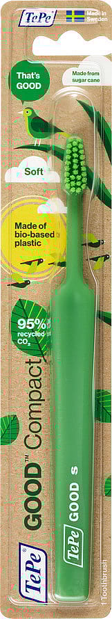Tandbørstehovedet er smalt for let at kunne nå alle overflader i munden, og børsterne er afrundede for blid børstning. TePe GOOD Compact Soft fås med bløde børster.