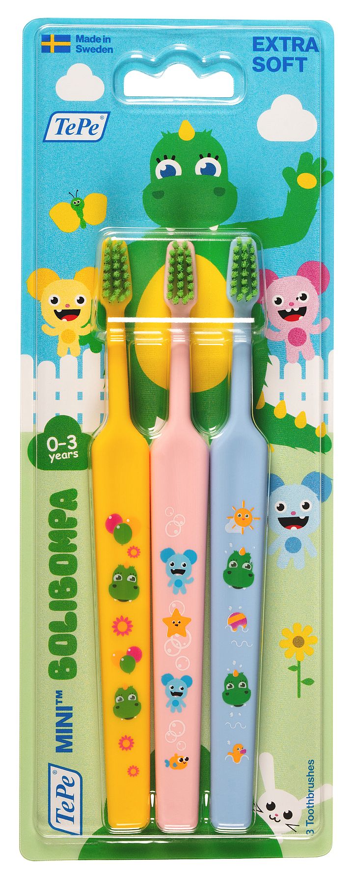TePe Mini™ Bolibompa er en skånsom tandbørste til små børn, som kan bruges fra den første tand og op til 3 år. Tandbørsten er designet med farverige og legende Bolibompa motiver, der gør tandbørstningen sjovere og hjælper med at skabe gode vaner tidligt.