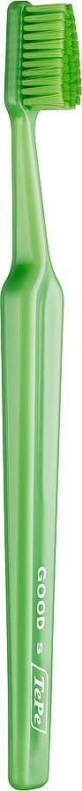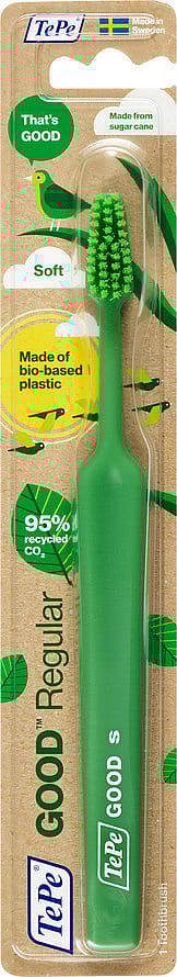 Tandbørstehovedet er smalt for let at kunne nå alle overflader i munden, og børsterne er afrundede for blid børstning. TePe GOOD Regular fås med bløde børster.