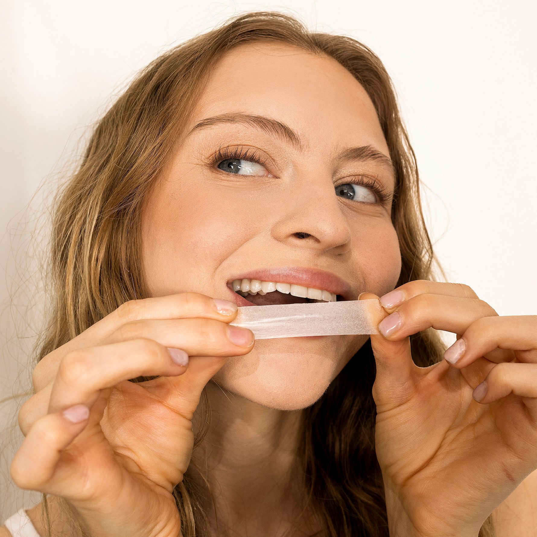 The Humble Co. Whitening Strips er fremstillet med naturlige ingredienser og en peroxidfri, ikke-slidende formel, der beskytter emaljen og skånsomt gør tænderne hvidere.