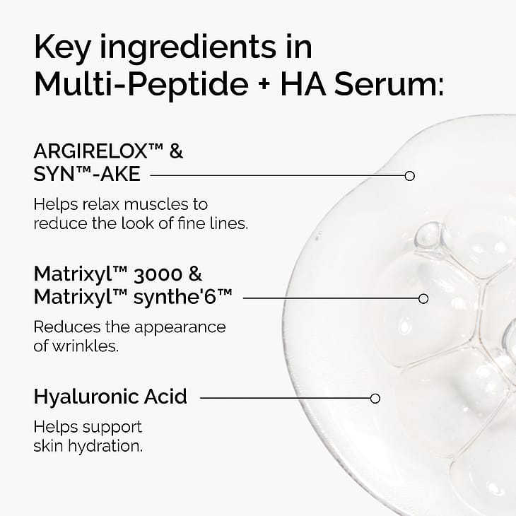 Aqua (Water), Glycerin, Lactococcus Ferment Lysate, Acetyl Hexapeptide-8, Pentapeptide-18, Palmitoyl Tripeptide-1, Palmitoyl Tetrapeptide-7, Palmitoyl Tripeptide-38, Dipeptide Diaminobutyroyl Benzylamide Diacetate, Acetylarginyltryptophyl Diphenylglycine, Sodium Hyaluronate Crosspolymer, Sodium Hyaluronate, Allantoin, Glycine, Alanine, Serine, Valine, Isoleucine, Proline, Threonine, Histidine, Phenylalanine, Arginine, Aspartic Acid, Trehalose, Fructose, Glucose, Maltose, Urea, Sodium Pca, Pca, Sodium Lactate, Citric Acid, Hydroxypropyl Cyclodextrin, Sodium Chloride, Sodium Hydroxide, Butylene Glycol, Pentylene Glycol, Acacia Senegal Gum, Xanthan Gum, Carbomer, Polysorbate 20, Ppg-26-Buteth-26, Peg-40 Hydrogenated Castor Oil, Trisodium Ethylenediamine Disuccinate, Ethoxydiglycol, Sodium Benzoate, Caprylyl Glycol, Ethylhexylglycerin, Phenoxyethanol, Chlorphenesin. Please be aware that ingredient lists may change or vary from time to time. Please refer to the ingredient list on the product package you receive for the most up to date list of ingredients.