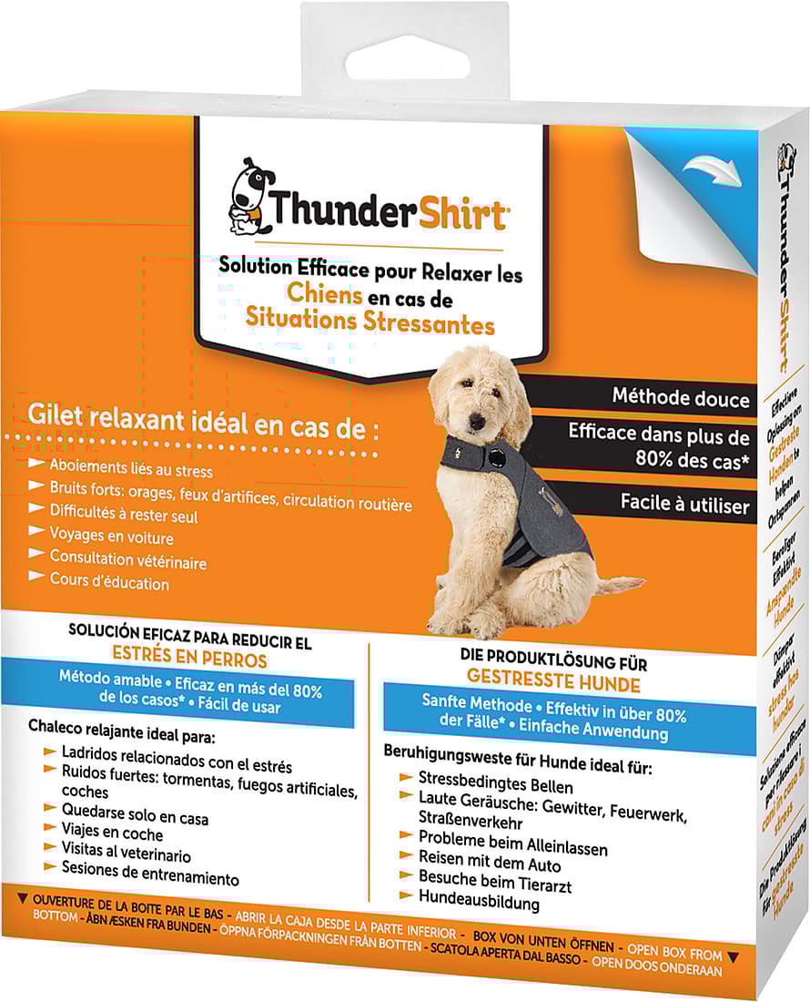 ThunderShirt er designet, så den er nem at tage af og på – den skal hverken trækkes over hundens hoved eller ben. Når jakken har den rigtige størrelse og er korrekt påsat, så den sidder tæt men behageligt, vil din hund føle sig godt tilpas.80% af alle hundeejere, der bruger ThunderShirt, fortæller, at deres hund virker mere rolig og afslappet, når den har den på.