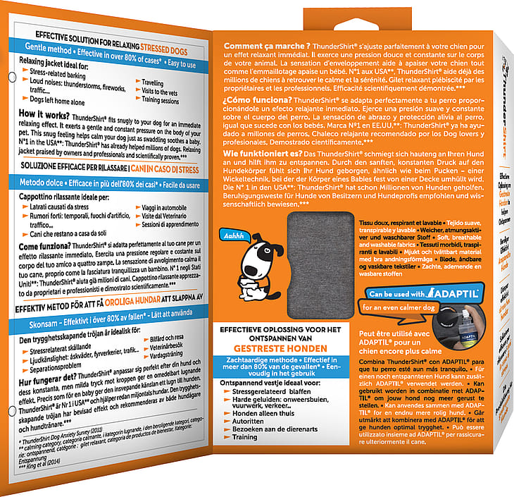 ThunderShirt er designet, så den er nem at tage af og på – den skal hverken trækkes over hundens hoved eller ben. Når jakken har den rigtige størrelse og er korrekt påsat, så den sidder tæt men behageligt, vil din hund føle sig godt tilpas.80% af alle hundeejere, der bruger ThunderShirt, fortæller, at deres hund virker mere rolig og afslappet, når den har den på.