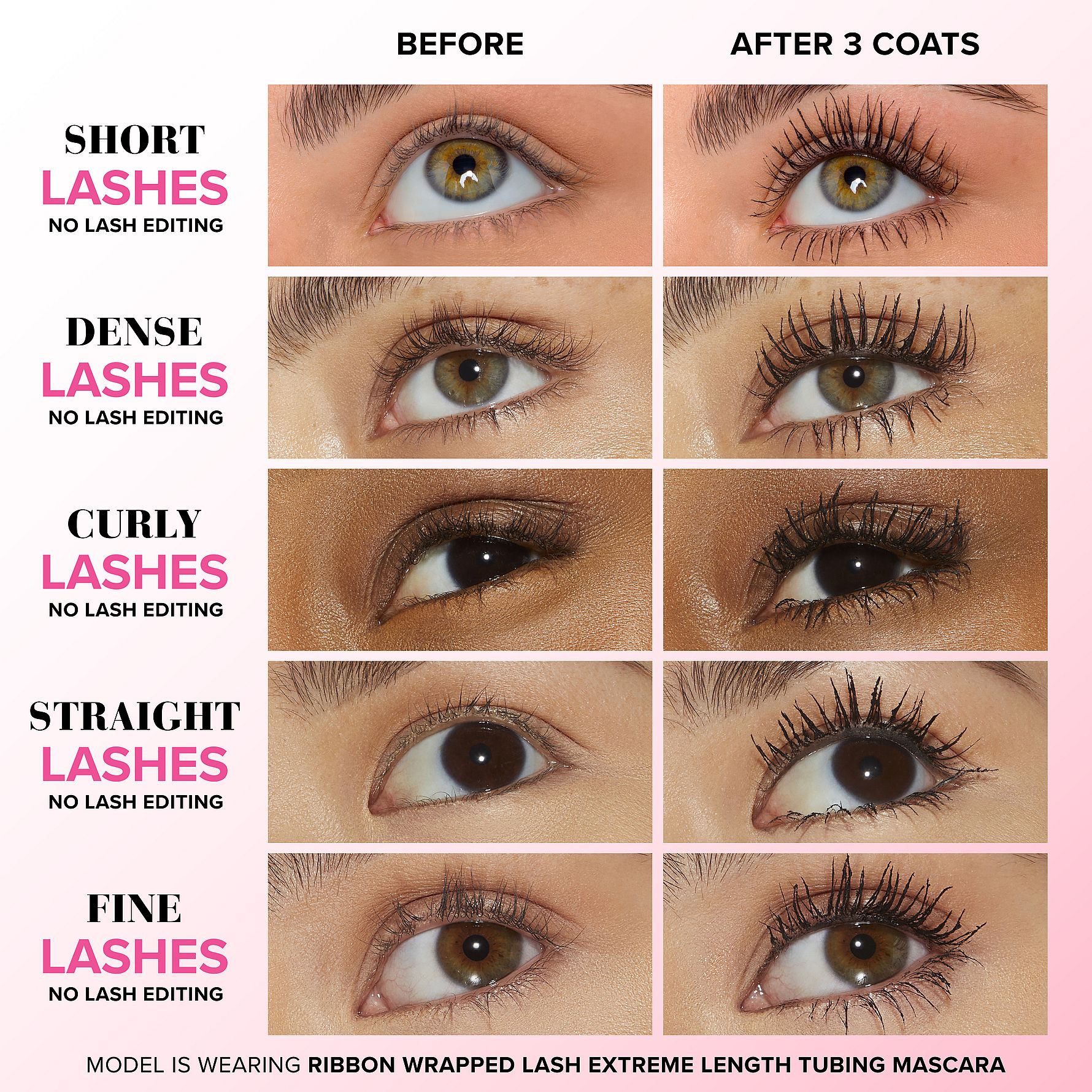 Den transformative Ribbon Wrap™ -teknologi skaber et superforlænget "wrap" omkring vipperne, der strækker dem til utrolige længder, mens Lash Extension™ -børsten fanger alle vippetyper, herunder fine, sparsomme, korte, lige, krøllede, nedadgående og stramme vipper.
