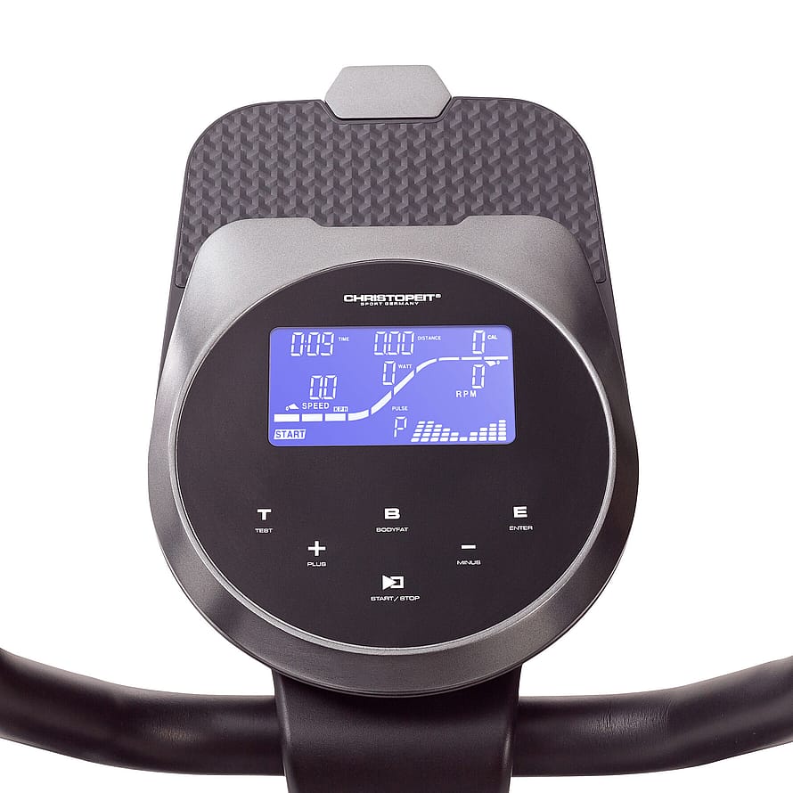 Den brugervenlige computer med et baggrundsbelyst LCD-display viser dig alle vigtige værdier såsom tid, distance, hastighed, kalorieforbrug, puls, RPM, watt og ODO på et øjeblik. Den intuitive betjening giver mulighed for nem navigation gennem de forskellige programmer, herunder 12 forudindstillede træningsprogrammer og 5 pulsbaserede programmer til tilpasset træning.