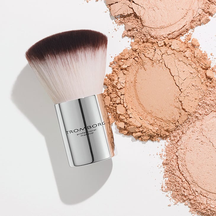 Dup børsten let i dit valgte pudderprodukt. Bank overskydende produkt af. Påfør med cirkulære bevægelser for en jævn og naturlig finish.