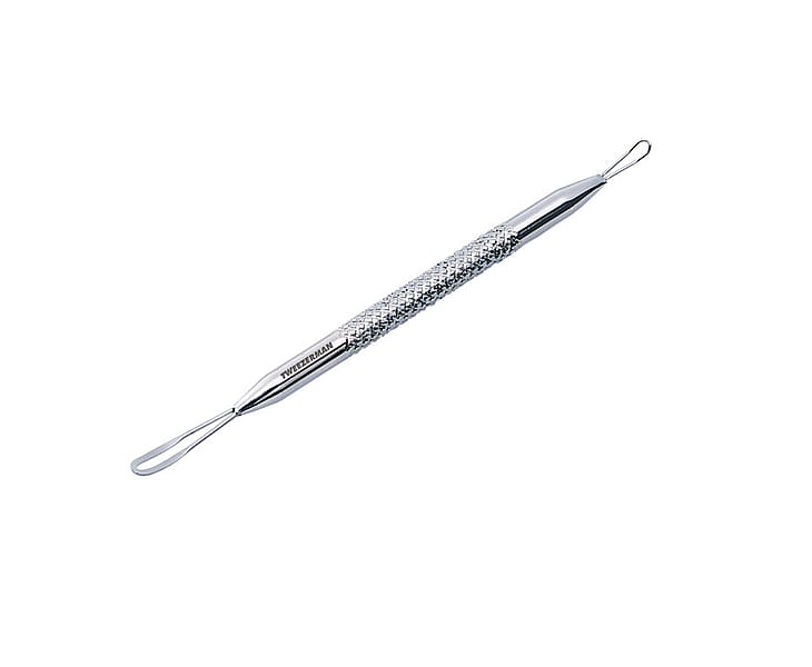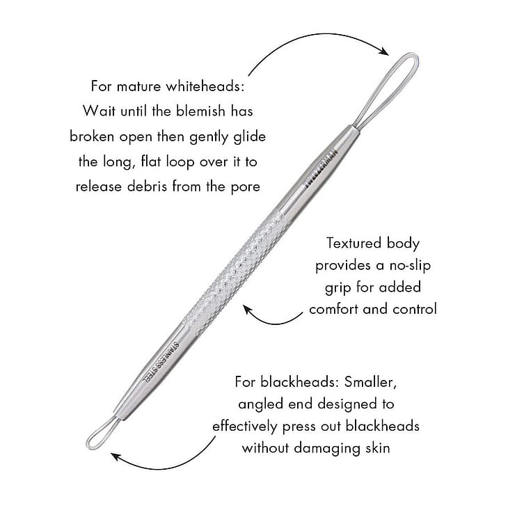 Værktøjet kombinerer en lang, flad løkke til blid presning af hvide hudorme og en kort, vinklet løkke til effektiv fjernelse af sorte hudorme. Overfladen er behandlet for at give ekstra greb, så håndteringen føles sikker og kontrolleret. Den simple form gør det velegnet til hjemmebrug for dem, der ønsker et præcist værktøj frem for fingrene. Brug altid med forsigtighed og undgå hårdt pres for at skåne huden.