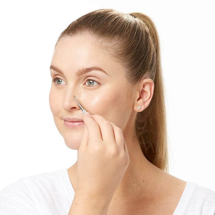 2. Med hensyn til hvide hudorme skal du vente indtil hudormen har åbnet sig og dernæst forsigtigt føre den lange flade løkke henover den for at fjerne det sidste fra poren.