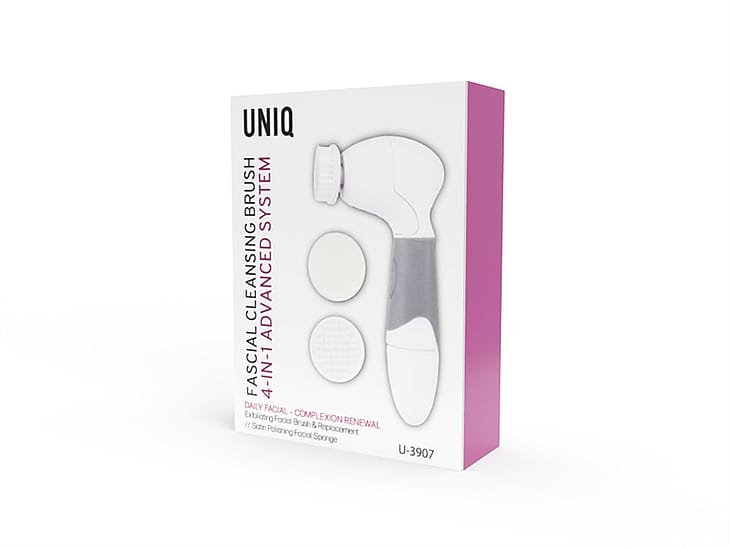 4-i-1 Elektrisk ansigtsbørste fra UNIQ som renser ansigt og hud effektivt, sikkert og blidt. På børstehovedet kan du vælge mellem 3 forskellige børstetyper. Den ene renser forsigtigt kinderne, mens den anden renser t-zonen i dybden og nummer 3 er en grovere peeling børste.