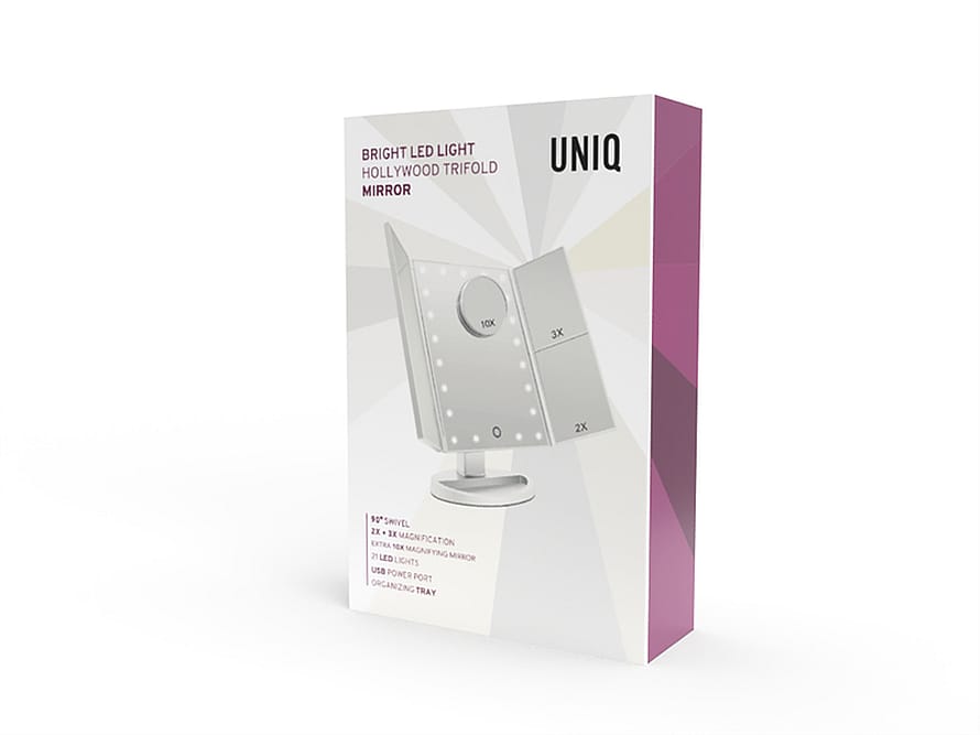 UNIQ Hollywood Makeup Trifold Spejl med Lys - dit ultimative værktøj til fejlfri makeup. Dette elegante spejl er inspireret af Hollywoods glamour og er designet til at give dig den perfekte belysning og de nødvendige funktioner til at skabe professionelle resultater derhjemme.