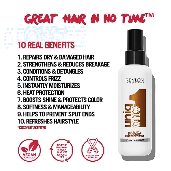 Enestående leave-in hårkur på spray med 10 unikke egenskaber, der alle giver synlige resultater og gør hverdagen lidt nemmere.