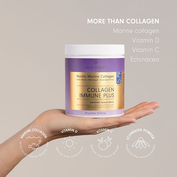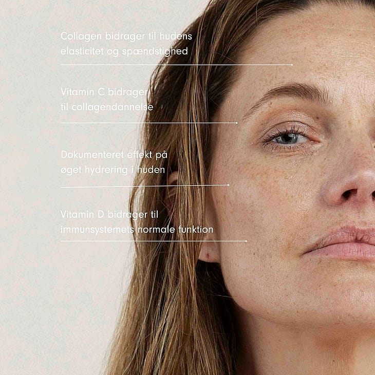 Collagenet har en effekt på rynker og fine linjer i huden. Udtræk fra echinacea støtter immunforsvaret, mens vitamin C fra bær og vitamin D fra svampe, bidrager til immunforsvarets normale funktion.