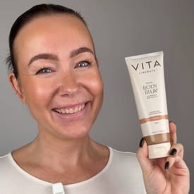 Kropsmakeup. Slører ujævnheder og giver øjeblikkelig fejlfri glød.