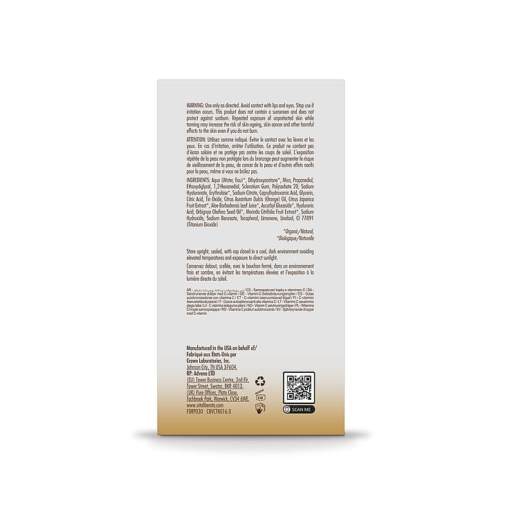 Aqua (Water, Eau)*, Dihydroxyacetone*, Mica, Propanediol, Ethoxydiglycol, 1, 2-Hexanediol, Sclerotium Gum, Polysorbate 20, Sodium Hyaluronate, Limonene, Erythrulose*, Sodium Citrate, Caprylhydroxamic Acid, Glycerin, Citric Acid, Tin Oxide, Citrus Aurantium Dulcis (Orange) Oil, Citrus Japonica Fruit Extract*, Aloe Barbadensis Leaf Juice*, Ascorbyl Glucoside*, Hyaluronic Acid, Orbignya Oleifera Seed Oil*, Linalool, Morinda Citrifolia Fruit Extract*, Sodium Hydroxide, Sodium Benzoate, Tocopherol, CI 77891 (Titanium Dioxide) *Organic/Natural