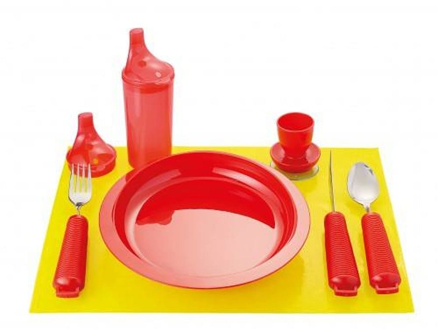 Alzheimers sæt er specielt designet til folk, der lider af Alzheimers. Spisesættet indeholder: 1 stk. rød tallerken med høj kant og sugekop 1 stk. rødt æggebæger med sugekop 1 stk. rød tudkop 250 ml. 1 sæt rødt gribevenlig bestik (kniv, gaffel, ske) 1 stk. gult skridhæmmende underlag 30 x 40 cm