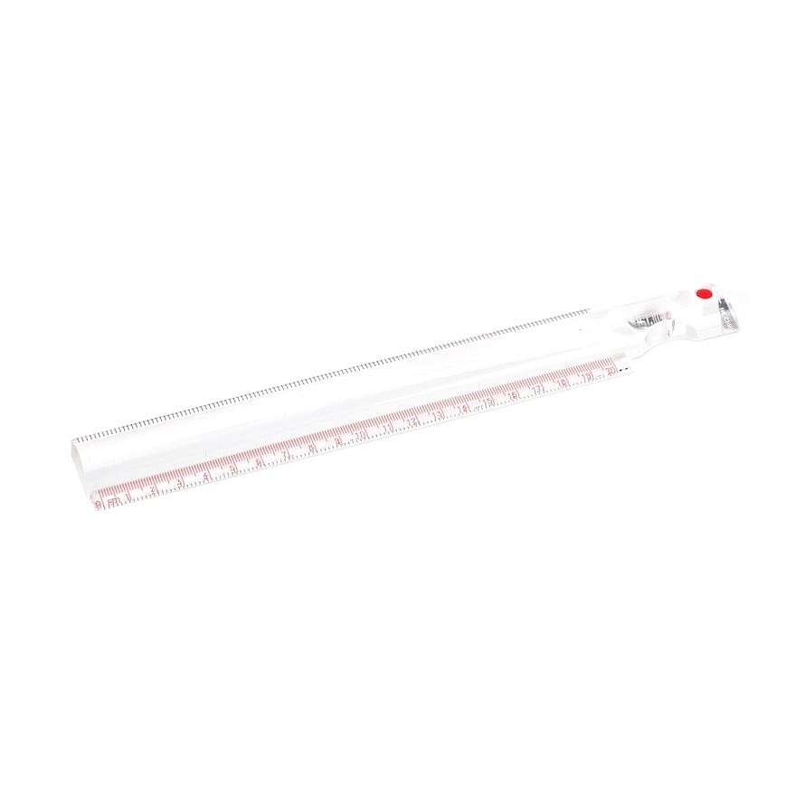 Lineal med afrundede kanter, som yderligere kan anvendes som et forstørrelsesglas. Linealen er 20 centimeter lang og foranstaltninger både centimeter og tommer.