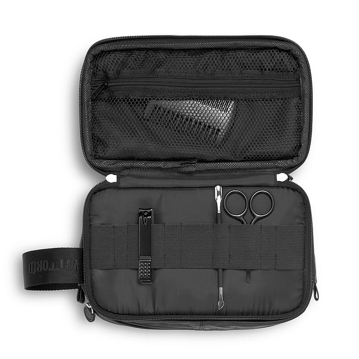 Toilettaske inklusiv produkter til den skæggede mand. Udover toilettasken medfølger der en dobbeltsidet skægkam, en skægsaks til pleje af dit skæg, et multitool med bl.a. neglerenser og neglebåndsskubber og en en 3 i én.
