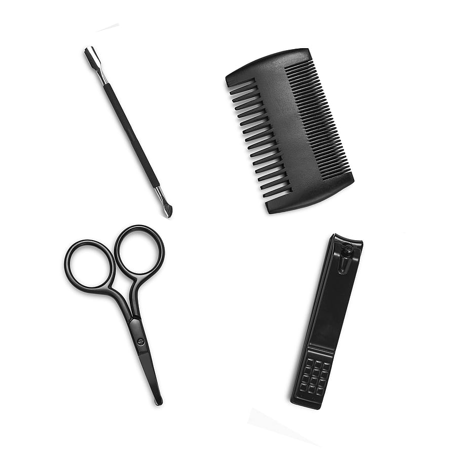 Toilettaske i ægte lammeskinds-læder, inklusiv produkter til den skæggede mand. Udover toilettasken medfølger der en dobbeltsidet skægkam, en skægsaks til pleje af dit skæg, et multitool med bl.a. neglerenser og neglebåndsskubber, og en en 3 i én.