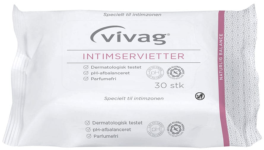 Daglig velvære: Vivag Intimservietter 30stk er skånsomme ogekstra milde, velegnet til vask af den intime zone. Servietterneer dermatologisk testet, parfumefri og fugtighedsbevarende.Intimservietterne har en lav pH-værdi specielt tilpasset underlivet.Giver dig en forfriskende og ren følelse. Intimservietterneer perfekt til at tage med på rejser og kan benyttes ved menstruationeller let urininkontinens.