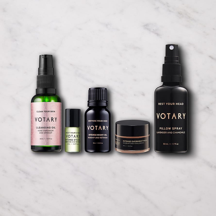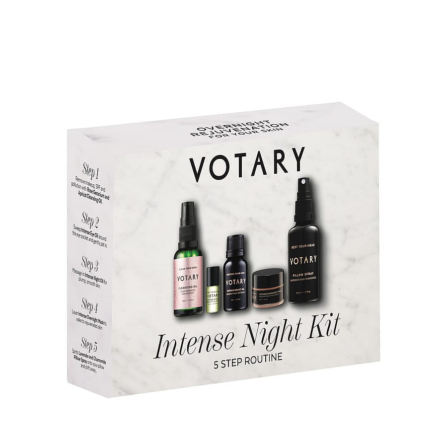 Rose Geranium Cleansing OilHelianthus Annuus (Sunflower) Seed Oil, Prunus Armeniaca (Apricot) Kernel Oil, Simmondsia Chinensis (Jojoba) Seed Oil, Vitis Vinifera (Grape) Seed Oil, Tocopherol, Pelargonium Graveolens (Rose Geranium) Flower Oil, Anthemis Nobilis (Chamomile) Flower Oil, Limonene+, Citronellol+, Geraniol+, Linalool+Intense Eye Oil, 2mlPrunus Amygdalus Dulcis (Sweet Almond) Oil, Vitis Vinifera (Grape) Seed Oil, Prunus Armeniaca (Apricot) Kernel Oil, Persea Gratissima (Avocado) Oil, Punica Granatum (Pomegranate) Seed Oil, Solanum Lycopersicum (Tomato) Seed Oil, Helianthus Annuus (Sunflower) Seed Oil, Caprylic/Capric Triglyceride, Dimethyl Isosorbide, Tocopherol, Iris Pallida (Sweet Iris) Leaf Cell Extract, Polianthes Tuberosa Callus (Tuberoses) Extract, Hydroxypinacolone Retinoate, Rosa Damascena (Rose) Flower Oil, Spilanthes Acmella (Paracress) Extract, Rosmarinus Officinalis (Rosemary) Leaf Extract, Pelargonium Graveolens (Geranium) Flower Oil, Citronello+, Geraniol+, Lianlool+, Eugenol+, Citral+, Farnesol+Intense Night Oil, 15mlVitis Vinifera (Grape) Seed Oil, Prunus Armeniaca (Apricot) Kernel Oil, Persea Gratissima (Avocado) Oil, Rosa Canina (Rosehip) Fruit Oil, Helianthus Annuus (Sunflower) Seed Oil, Fusanus Spicatus (Sandalwood) Kernel Oil, Solanum Lycopersicum (Tomato) Seed Oil, Tocopherol, Caprylic/Capric Triglyceride, Dimethyl Isosorbide, Hydroxypinacolone Retinoate, Spilanthes Acmella (Paracress) Extract, Calendula Officinalis (Marigold) Flower Extract, Rosmarinus Officinalis (Rosemary) Leaf Extract, Rosa Damascena (Rose) Flower Oil, Pelargonium Graveolens (Geranium) Flower Oil, Linalool+, Citral+, Citronellol+, Geraniol+, Eugenol+Intense Overnight Mask, 15mlAloe Barbadensis (Aloe Vera) Leaf Juice, Aqua (Water), Cetearyl Alcohol, Coco-Caprylate, Glycerin, Glyceryl Stearate, Coconut Alkanes, Solanum Lycopersicum (Tomato) Seed Oil, Cetearyl Glucoside, Rosa Canina (Rosehip) Fruit Oil, Persea Gratissima (Avocado) Oil, Prunus Armeniaca (Apricot) Kernel Oil, Sodium Hyaluronate, Narcissus Pseudo-Narcissus (Daffodil) Flower Extract, Avena Sativa (Oat) Kernel Flour, Chenopodium Quinoa (Quinoa) Seed Extract, Myrciaria Dubia (Camu Camu) Fruit Extract, Pouteria Lucuma (Lucuma) Pulp Extract, Mauritia Flexuosa (Buriti) Fruit Oil, Nigella Sativa (Black Cumin) Seed Oil, Salvia Hispanica (Chia) Seed Oil, Helianthus Annuus (Sunflower) Seed Oil, Vitis Vinifera (Grape) Seed Oil, Glycine Soja (Soybean) Oil, Lavandula Angustifolia (Lavender) Herb Oil, Rosa Damascena (Rose) Flower Oil, Salicylic Acid, Caprylic/Capric Triglyceride, Citrus Nobilis (Mandarin Orange) Peel Oil, Citrus Aurantium Amara (Bitter Orange) Flower Oil, Sodium Phytate, Sodium Benzoate, Potassium Sorbate, Sorbic Acid, Astaxanthin, Sodium Stearoyl Glutamate, Citric Acid, Hydroxyacetophenone, Coco Caprylate/Caprate, Rosmarinus Officinalis (Rosemary) Leaf Extract, Benzyl Alcohol, Tocopherol, Limonene+, Linalool+, Citronellol+, Geraniol+, Hydroxycitronellal+, Citral+, Eugonol+, Farnesol+Pillow Spray, 50mlAlcohol Denat, Aqua (Water), Linalool+, Limonene+, Benzyl Alcohol+, Benzyl Benzoate+, Benzyl Salicylate+, Citral+, Citronellol+, Eugenol+, Farnesol+, Geraniol+, Isoeugenol+, ParfumFace Cloth100% Cotton+Naturally occurs in Essential Oils