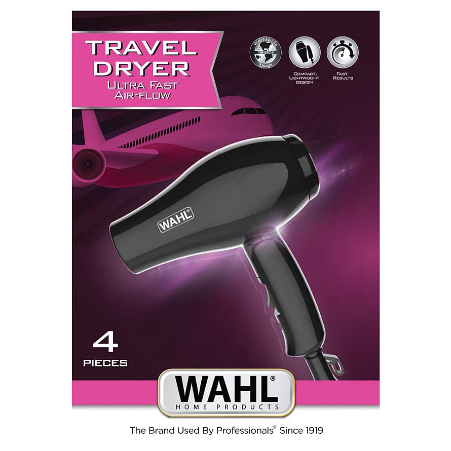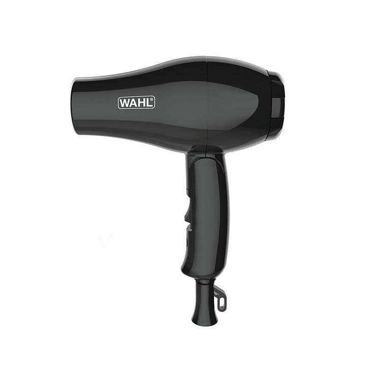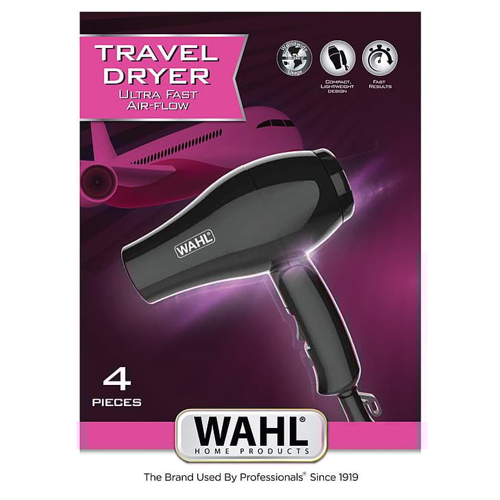Rejsehårtørrer fra WAHL®. Hårtørreren, der kan bruges i hele verden, er lige til at klappe sammen, så den næsten ingenting fylder i din kuffert.