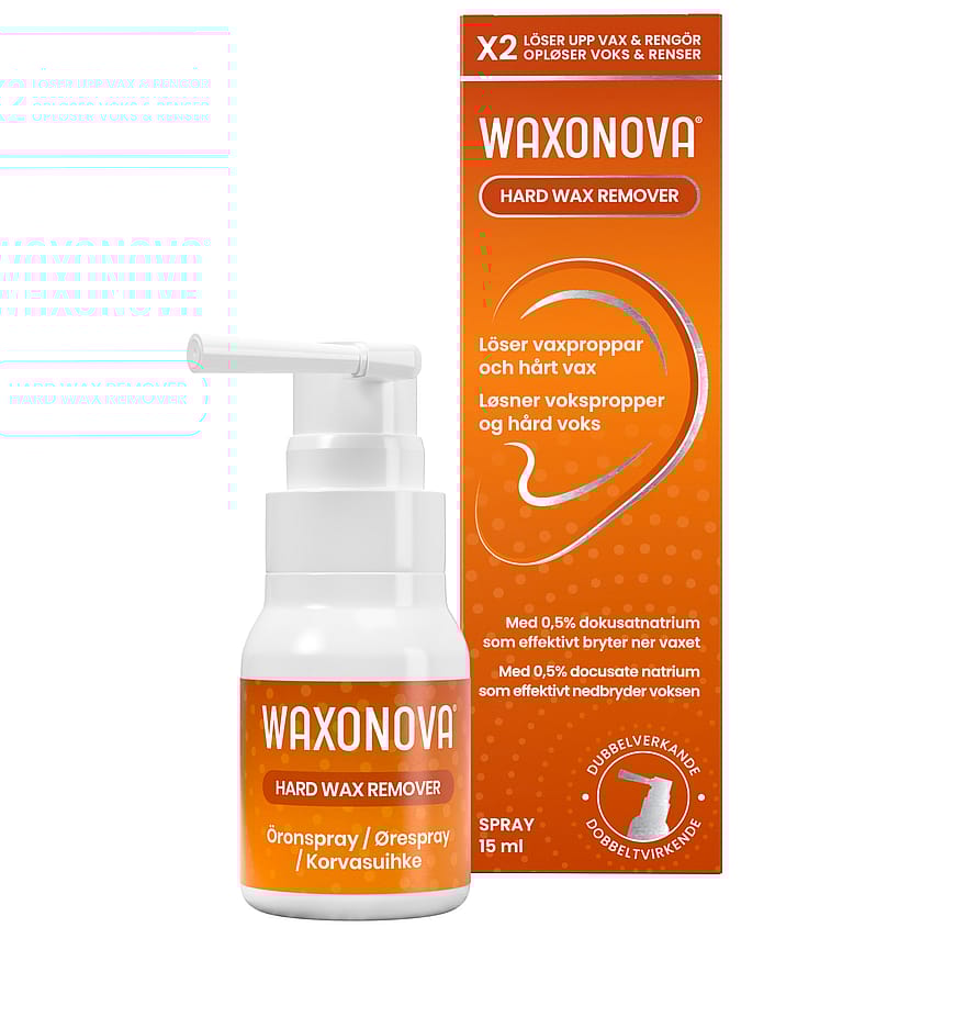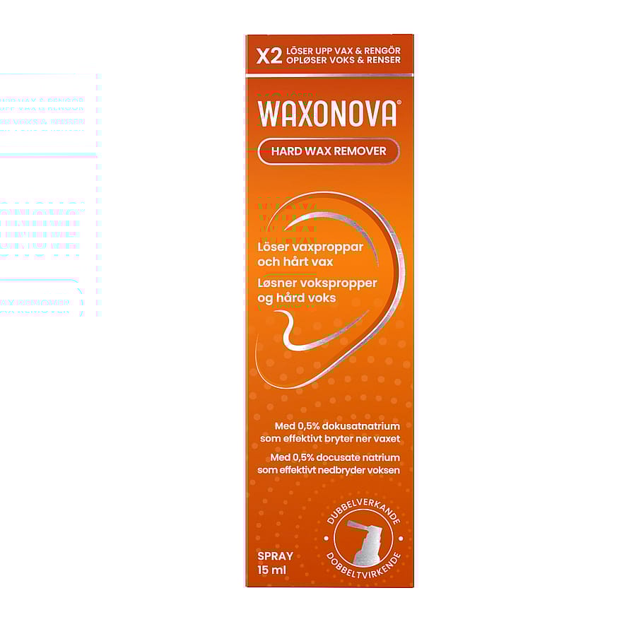 Waxonova® Hard Wax Remover opløser hård voks og vokspropper, mens den renser og smører den ydre øregang.
