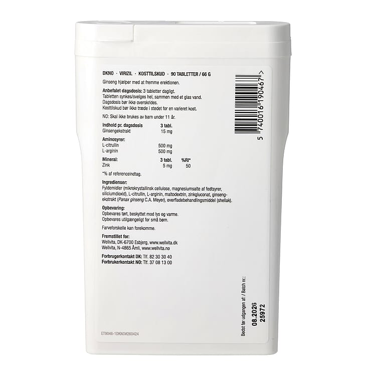 Kosttilskud. Virizil er udviklet specielt til mænd. Produktet indeholder bl.a. ginseng, som kan bidrage til udholdenhed, energi og vitalitet. Planten kan derudover hjælpe med vedligehold af det gode seksuelle samliv. Tabletterne tages dagligt for at opnå den rette effekt, men der kan gå nogle uger, før den mærkes.