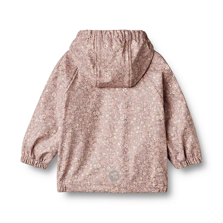 Regnjakken har aftagelig hætte, elastikker ved ærmerne og vandtæt lynlås med hagebeskytter.
