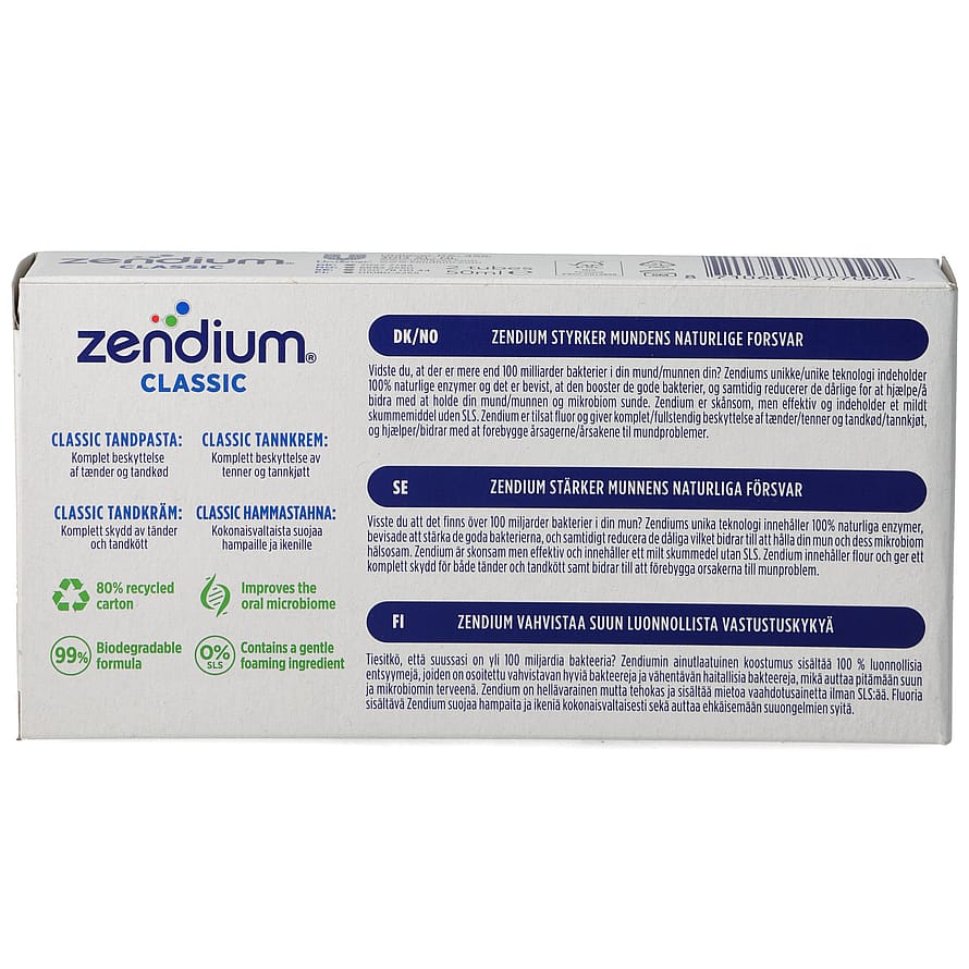 Zendium Classic plejer dine tænder effektivt og mildt. Tandpastaen indeholder både fluor, enzymer og colostrum. Fluor forstærker tandemaljen og beskytter mod karies. Enzymerne styrker mundens eget forsvar mod bakterier, belægninger og syreangreb. Hermed mindsker du risikoen for en række tandsygdomme. Slibemidlet i tandpastaen er skånsomt, så du undgår slibeskader på dine tænder.