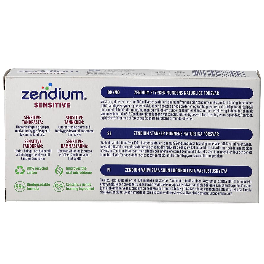 Zendium Sensitive er en tandpasta specielt udviklet til at beskyttelse blottede tandhalse og dermed reducere isninger i tænderne. Zendium Sensitive indeholder ekstra beskyttende og milde ingredienser.