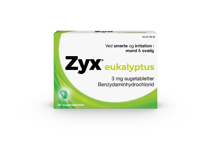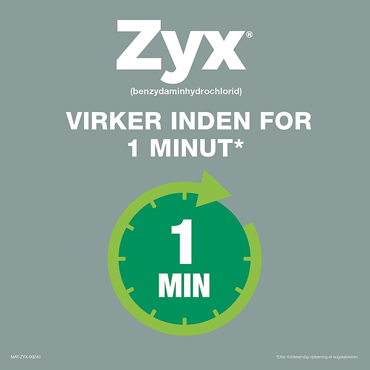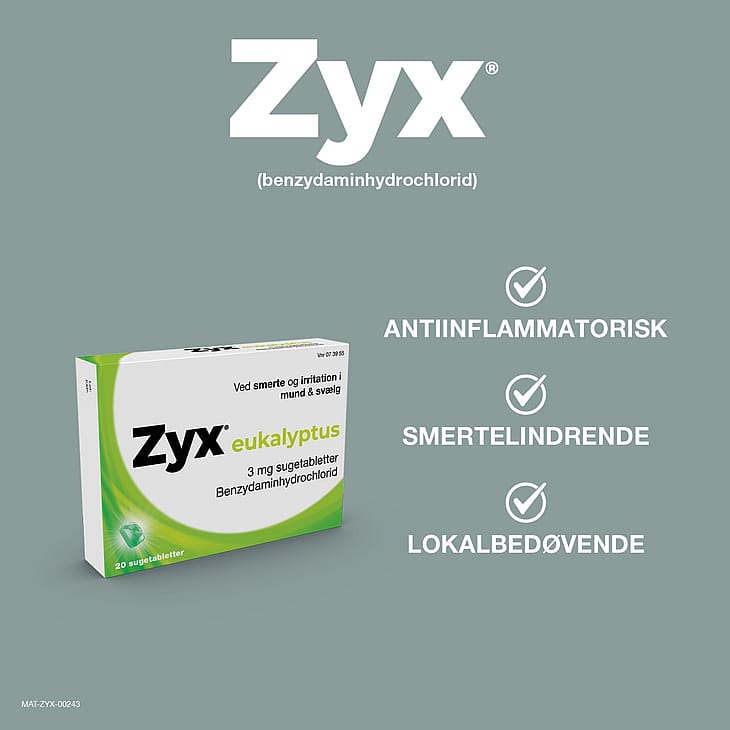 Zyx® sugetabletter virker antiinflammatorisk og lindrer smerte og irritation i mund og svælg.